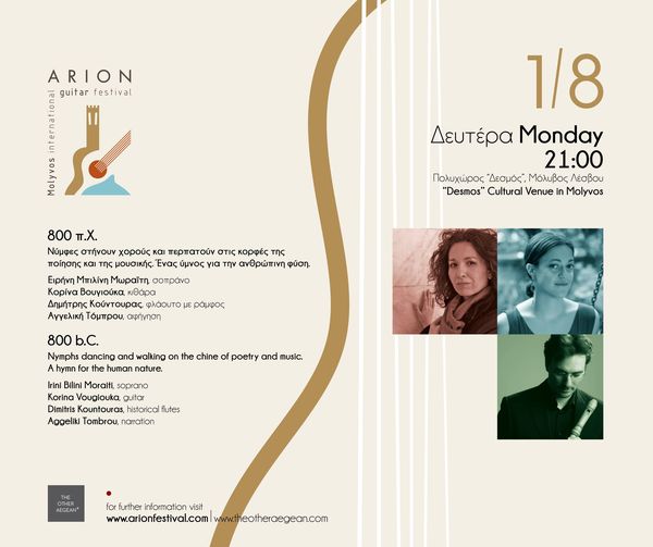 7 AYG ΣΥΝΑΥΛΙΑ | CONCERT Ψεύτες Ήλιοι και Η ομορφιά που ανθήζει , δύο κύκλοι τραγουδιών με την Θεοδώρα Μπάκα , Κορίνα Βουγιούκα , Θοδωρή Τζοβανάκη στο Δημαρχείο Μολύβου στις 21.30 για την 5η Θερινή Ακαδημία Κιθάρας Αρίων. Two songs circles for voice – guitar and piano with Theodora Baca, Korina Vougiouka and Thodoris Tzovanakis in Molyvos’ Town Hall – Lesvos – during 5th Summer Guitar Academy Arion
